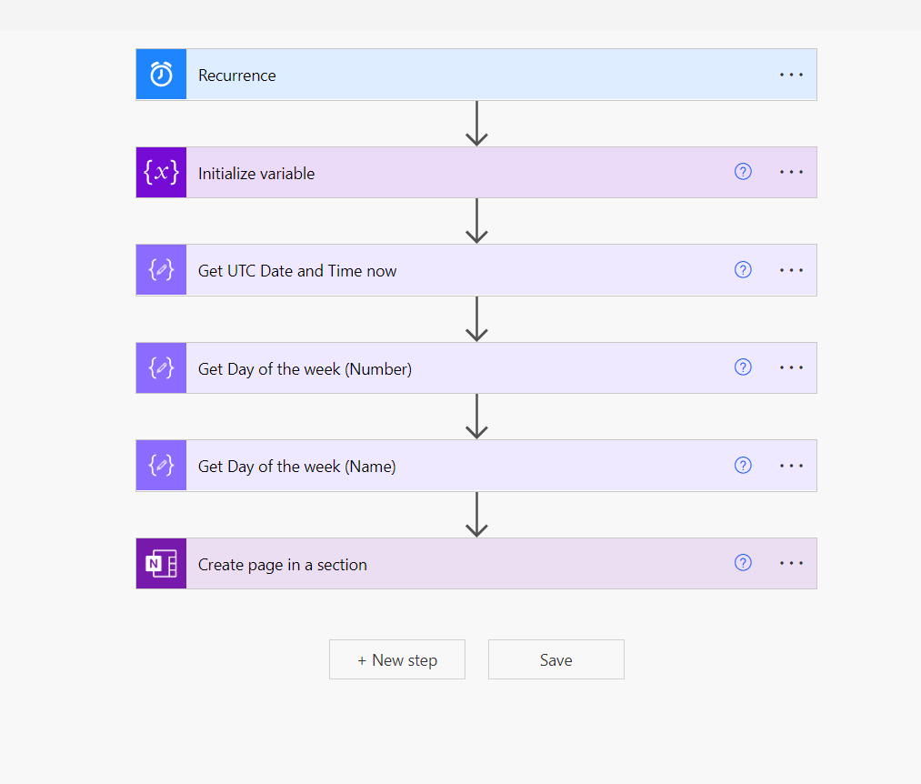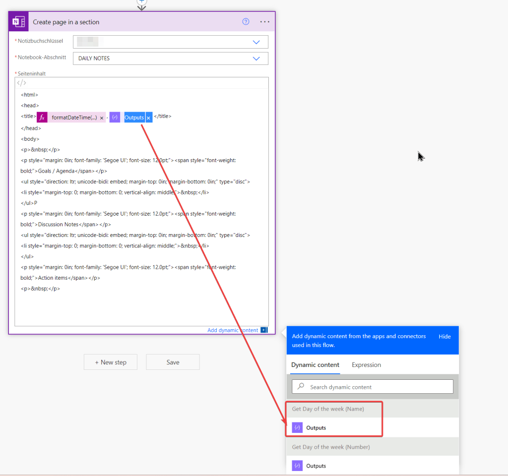 This flow creates a daily OneNote page within a OneNote Section(In my Case: „Daily Notes“ with the title of today’s date and the day of the week with the content you want in the page.